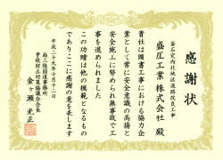盛圧工業の安全運転・事故防止の取り組みが認められ、平成29年度盛岡地区安全運転管理者部会の「安全運転管理者選任優良事業所」として盛岡西警察署長・盛岡地区安全運転管理者部会長連名より表彰状を頂きました。これからも交通事故防止に努めてまいります。